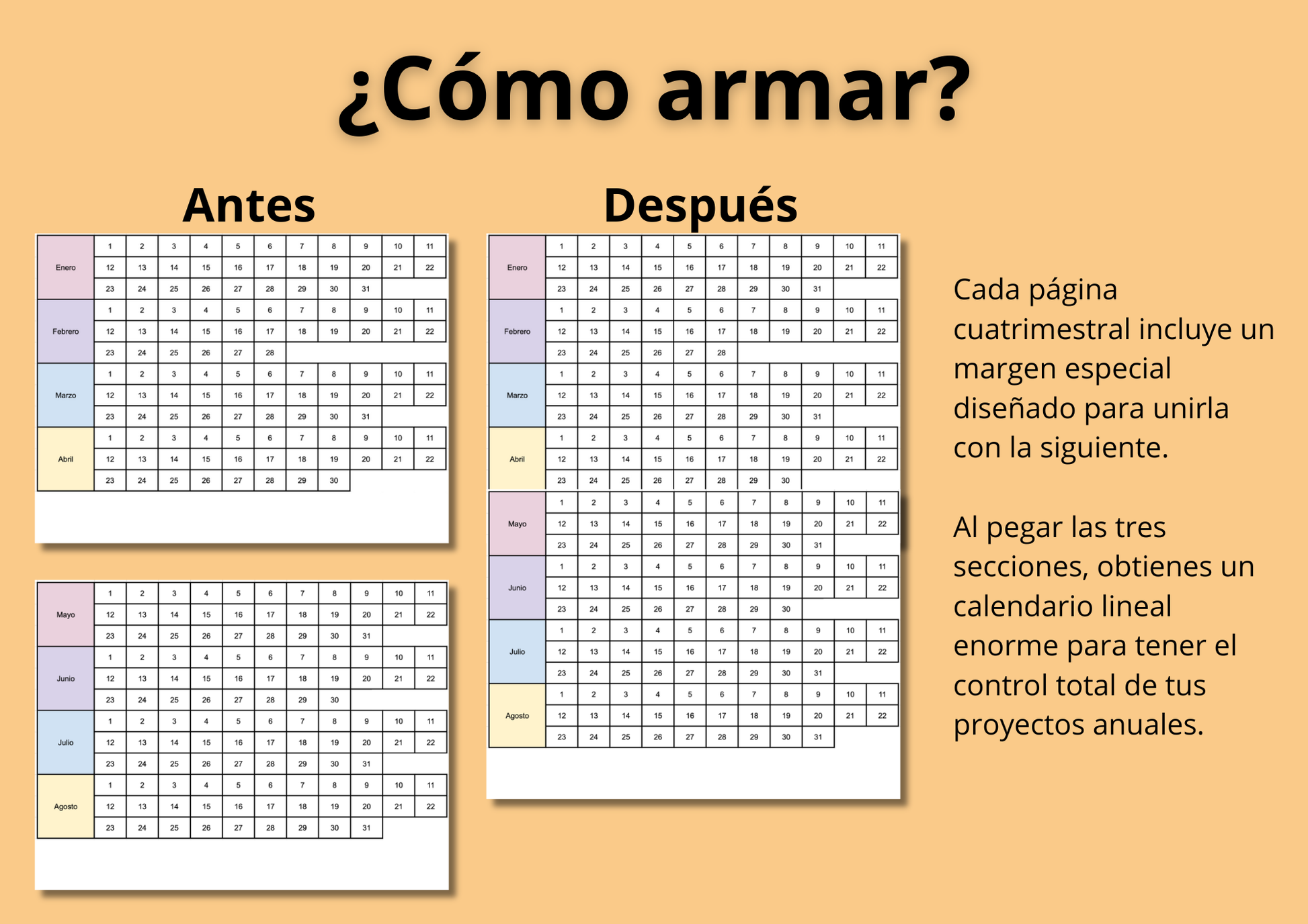 Fechas Establecidas: Olvida tener que escribir los días manualmente; este sistema ya viene configurado con los 365 días para que solo te preocupes por planificar.